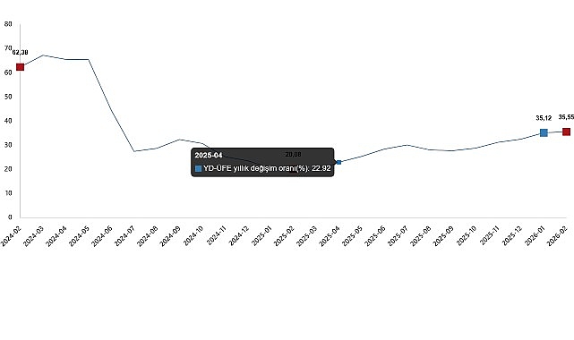 Yurt Dışı Üretici Fiyat Endeksi (YD-ÜFE) yıllık %35,55 arttı, aylık %2,38 arttı YD-ÜFE 2026 yılı Şubat ayında bir önceki aya göre %2,38 artış, bir önceki yılın Aralık ayına göre %6,53 artış...