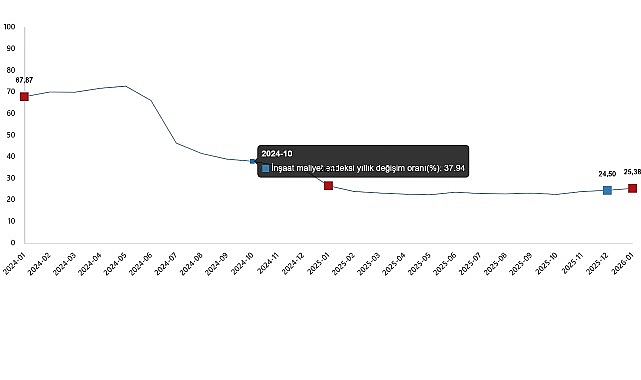 İnşaat maliyet endeksi yıllık %25,38 arttı, aylık %9,87 arttı İnşaat maliyet endeksi, 2026 yılı Ocak ayında bir önceki aya göre %9,87 arttı, bir önceki yılın aynı ayına göre %25,38 arttı.